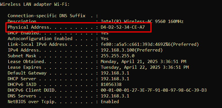 ipconfig /allTìm đến adapter mạng đang dùng (thường là Ethernet hoặc Wi-Fi) và ghi lại dòng: