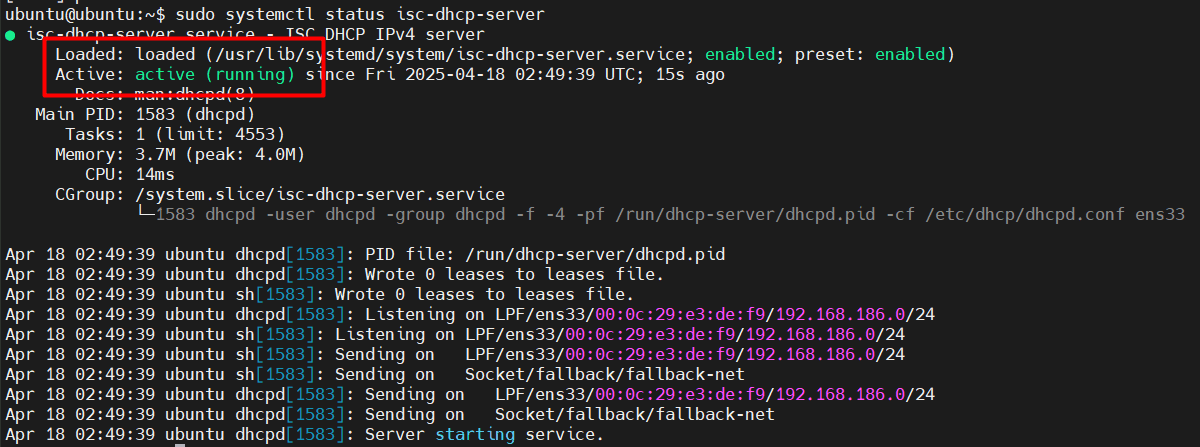 sudo systemctl status isc-dhcp-serverKết quả DHCP đang chạy:
