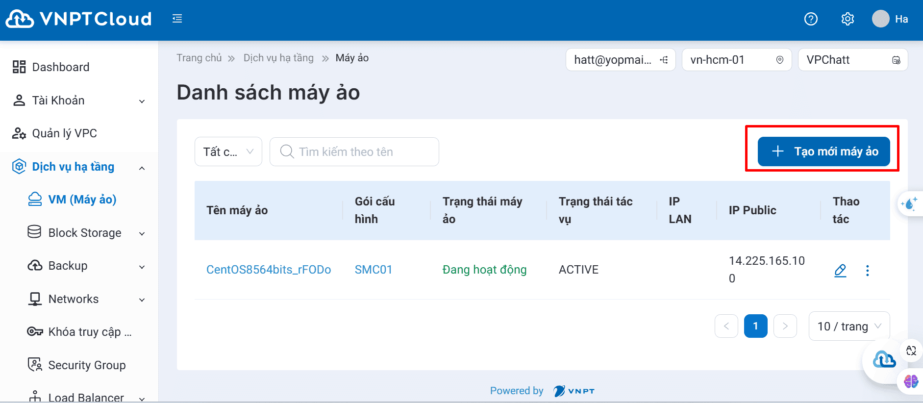 Đối với quý khách đã tạo dịch vụ trên hệ thống, hệ thống sẽ hiển thị màn hình danh sách dịch vụ, quý khách chọn button “Tạo mới máy ảo” ở góc bên phải màn hình.