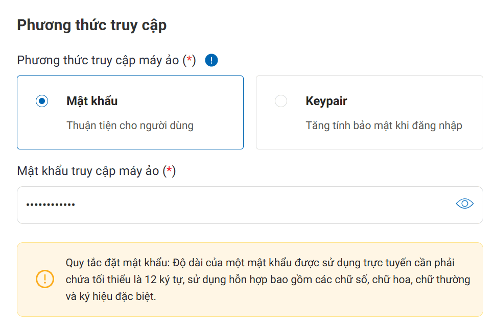 Quý khách có thể thực hiện cấu hình phương thức truy cập máy ảo sử dụng Mật khẩu hoặc Keypair