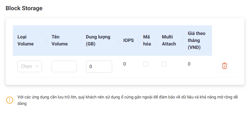 Với các server muốn dùng thêm 1 ổ cứng cho một mục đích nào đó ( VD: để lưu trữ data riêng với ổ cứng chứa hệ điều hành…) bạn có thể tick vào ô thêm ổ cứng, chọn loại (HDD hoặc SDD ) và chọn dung lượng. Nếu không cần thêm ổ cứng , bạn có thể bỏ qua bước này và bỏ tick ô chọn.