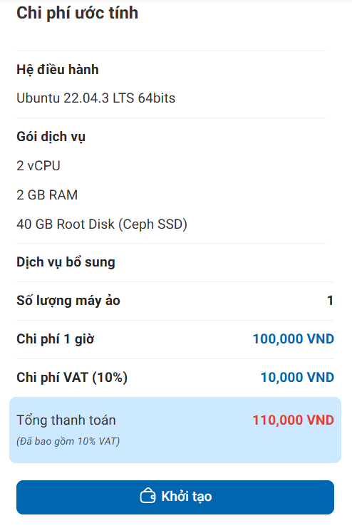 Sau khi khách hàng hoàn tất các bước cấu hình (chọn cấu hình máy ảo, hệ điều hành, mạng, bảo mật, v.v.), chọn “Khởi tạo” để chuyển sang bước thanh toán.