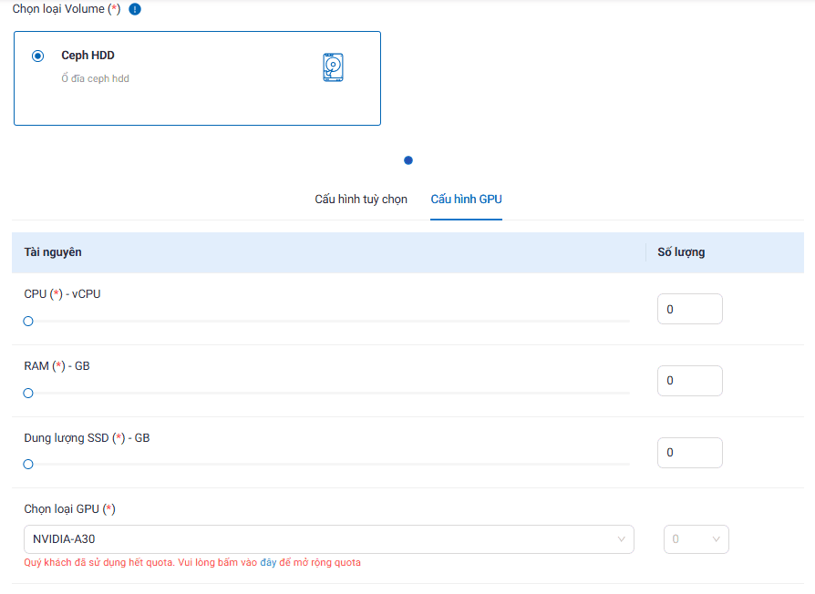 Cấu hình bao gồm các thông số về CPU, RAM và Disk (SSD), nếu chọn cấu hình GPU sẽ bổ sung thêm thông số về Loại GPU (NVIDIA – A30 và NVIDIA – A100)