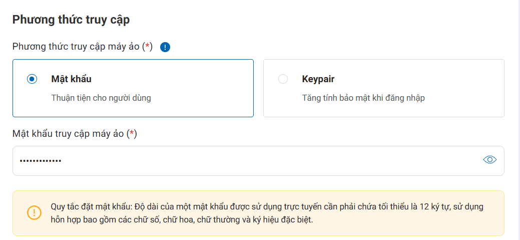 Quý khách có thể thực hiện cấu hình phương thức truy cập máy ảo sử dụng Mật khẩu hoặc Keypair