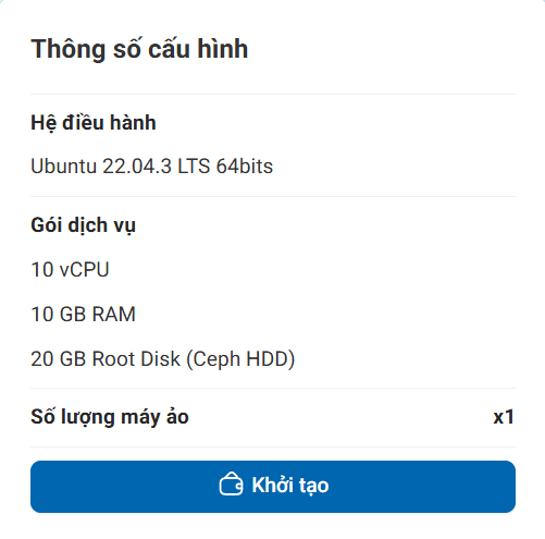 Sau khi khách hàng hoàn tất các bước cấu hình (chọn cấu hình máy ảo, hệ điều hành, mạng, bảo mật, v.v.), chọn “Khởi tạo” để chuyển sang bước xác nhận thông tin khởi tạo.