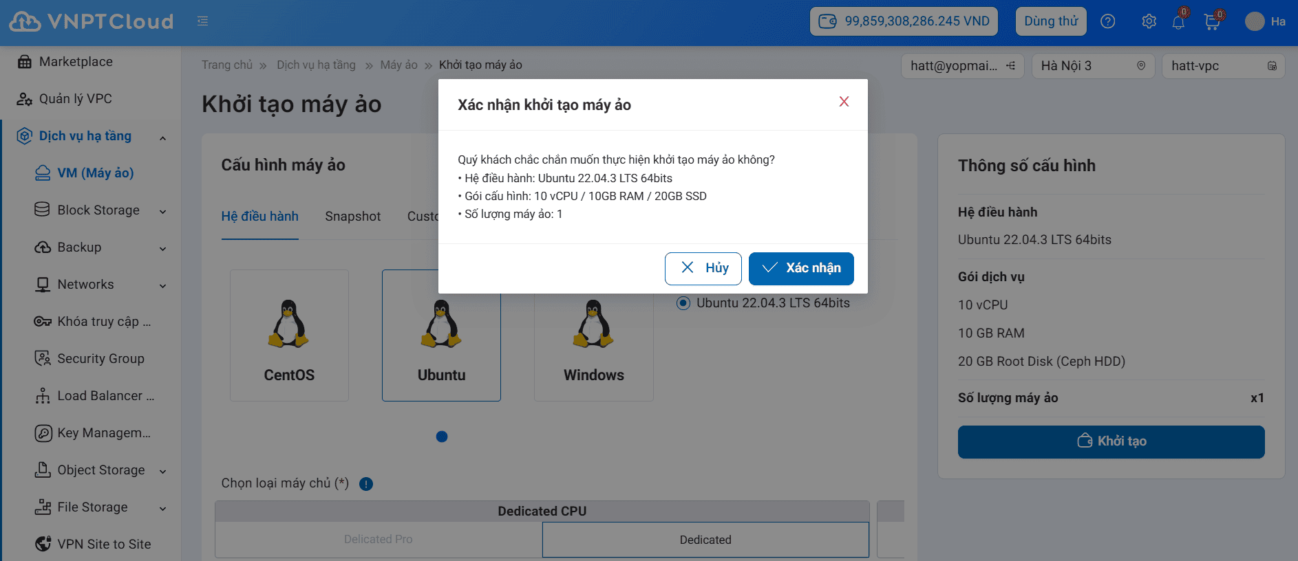 Hình 13: Khách hàng xác nhận thông tin khởi tạo máy ảo